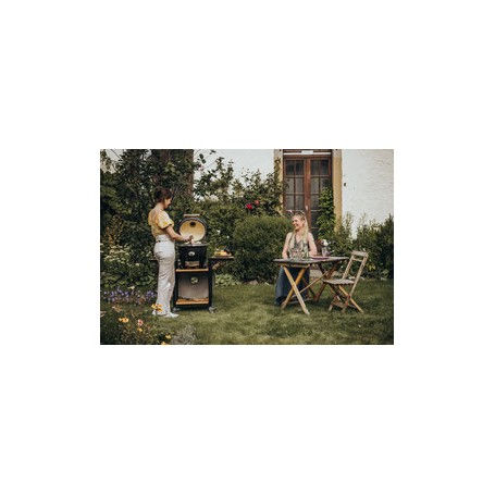 A black powder-coated frame with side tables made of acacia wood gives the little stars of the Monolith Grill family a stylish rolling cart.